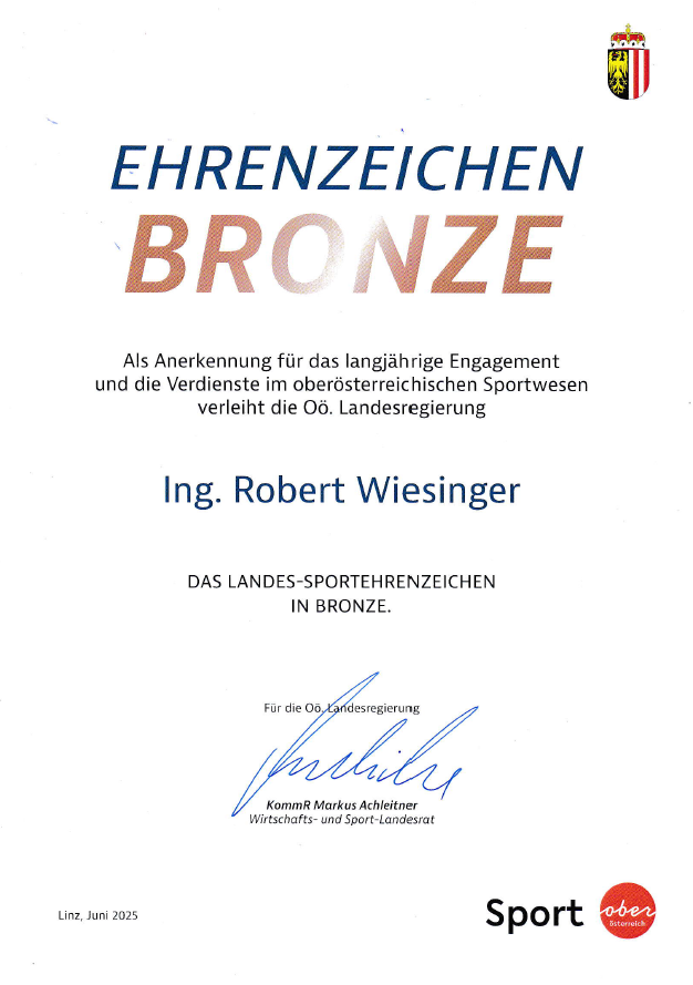 Am 16. September 2025 wurde das Landessportehrenzeichen in Bronze an verdiente Sportler:innen und Funktionär:innen verliehen. Der Wirtschafts- und Sportlandesrat Markus Achleitner zeichnete die Perönlichkeiten für ihre langjährigen Verdienste um das oberösterreichische Sportwesen aus.